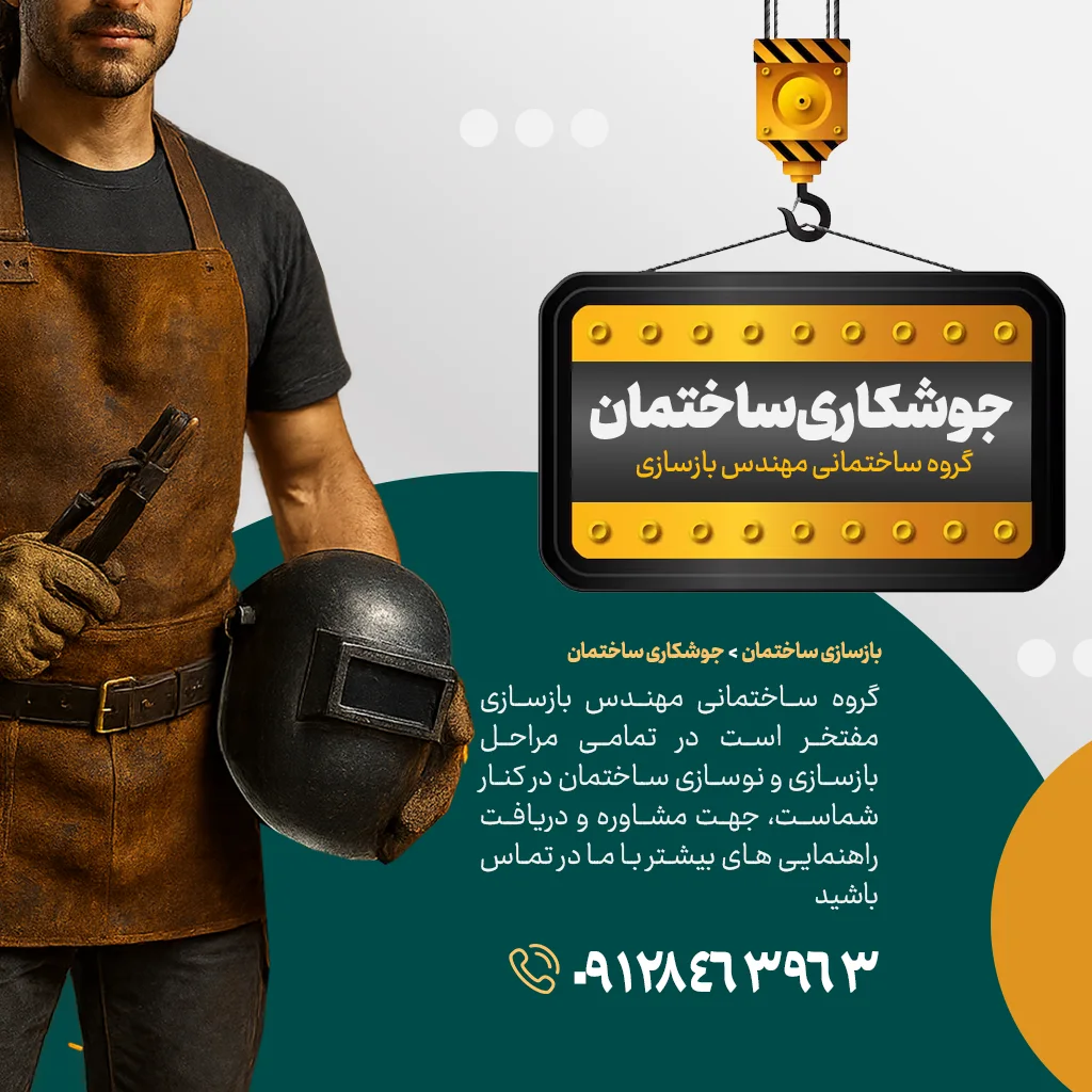 جوشکاری در دنیای ساخت و ساز امروز یک مهارت فنی و هنری است که کیفیت، استحکام و ایمنی ساختمان را ضمانت می کند و دیگر تنها اتصال دو قطعه فلزی نیست، شرکت مهندس بازسازی از طریق همکاری با نیروهای باتجربه و با استفاده از تجهیزات مدرن، به ارائه انواع خدمات جوشکاری برای انواع پروژه های ساختمانی، صنعتی و بازسازی می پردازد.